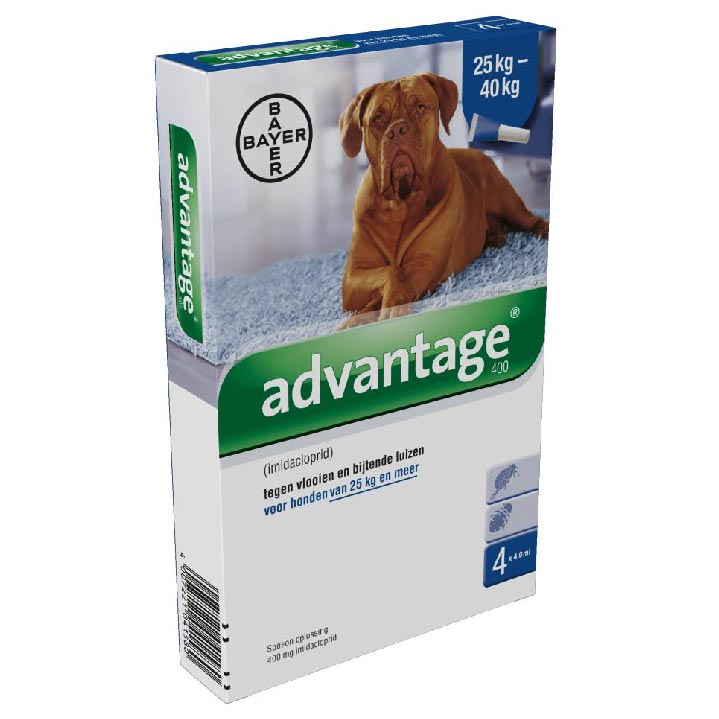 Advantage 400 is for the treatment of flea infestations in cats, dogs and rabbits and for the treatment of biting lice in dogs. Advantage contains imidacloprid, which acts on the nervous system of the flea to cause paralysis and subsequent death.