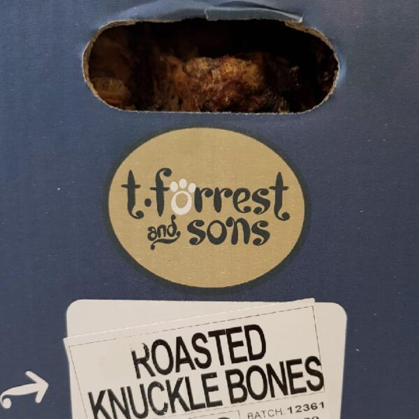 T Forrest and Sons roasted knuckle bones are a perfect for a treat or reward. The knuckle bones are slowly roasted in our ovens to obtain a perfect golden colour and perfect texture. This method has been passed down through generations, we know how to cook a perfect knuckle every time. These knuckles will provide your dog with long lasting enjoyment and regular chewing will help keep teeth and gums healthy.